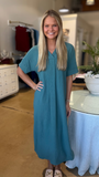 V neckline, front pleat detail, cuff sleeve, curved dolphin hem