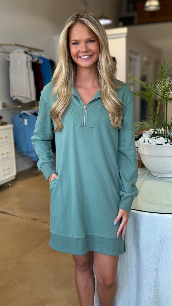 Long sleeve mineral washed cotton French terry casual zip dress with pockets.