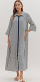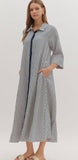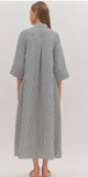 Striped 3/4 sleeve midi dress featuring hidden button closure. Side pockets. Woven non sheer lightweight