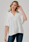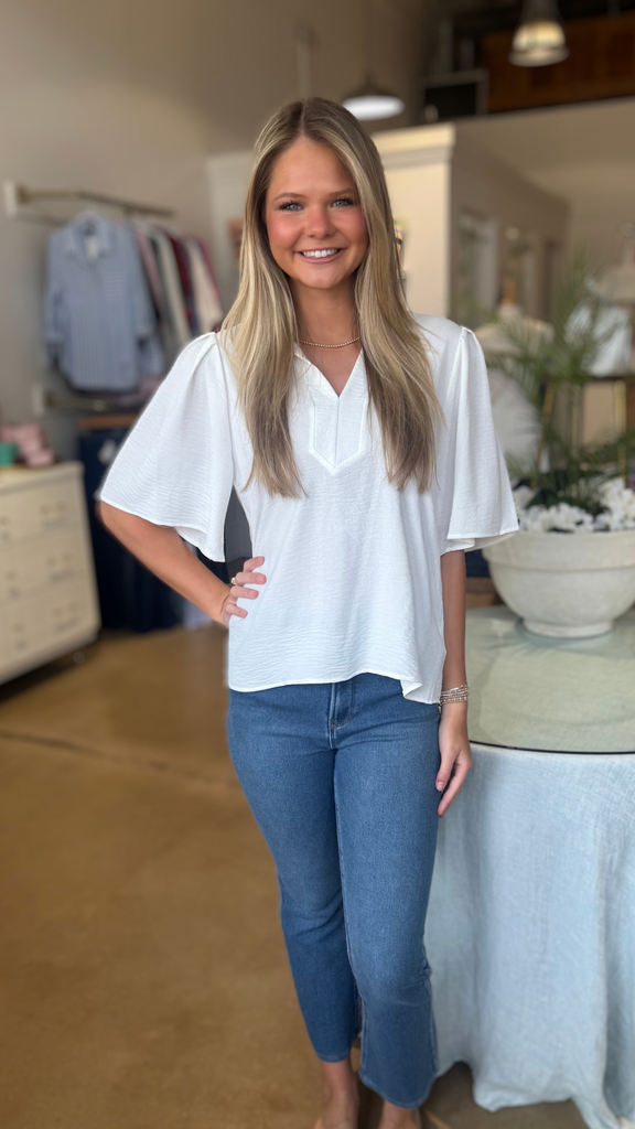Short Flutter Sleeve Top with Notch V Neck White.