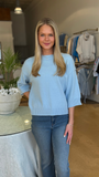 Reverse seam 3/4 sleeve sweater featuring crew neck with ribbed detail