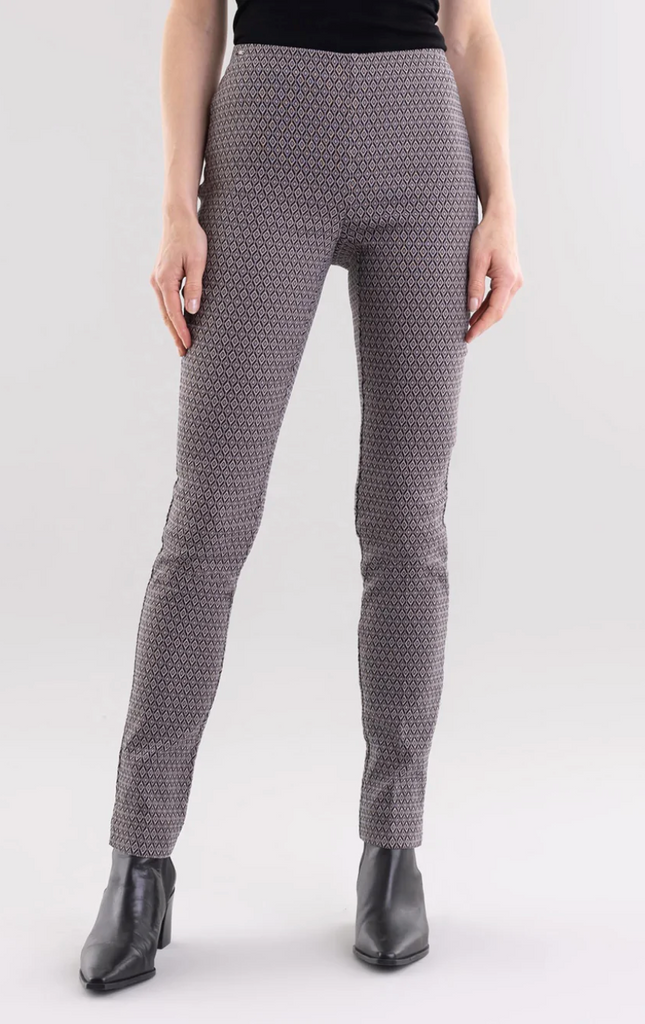 The 31" slim leg pant in a super stretch diamond jacquard pattern in grey, black and ivory.
