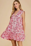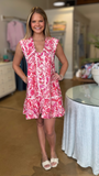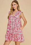 Floral print gold button-down dress with a sailor collar ruffle hem, side pockets, and piping details for a stylish touch