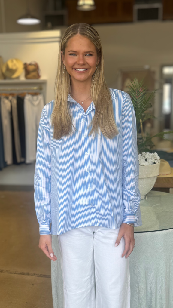Stripe button down blouse with back detail.
