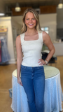 Solid sleeveless tank top featuring a square neckline and is a slightly fitted but stretchy body.