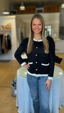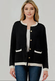 long sleeve cardigan with contrast trim color. Classic design with front pocket and gold buttons. Soft, luxurious viscose nylon sweater knit fabric.